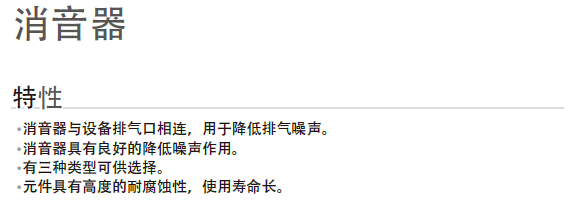 消音器與設(shè)備排氣口相連,用于降低排氣噪聲;消音器具有良好的降低噪聲作用;有三種類型可供選擇;元件具有高度的耐腐蝕性,使用壽命長(zhǎng)。