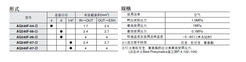 省空間;IN-OUT的連接配管是直線方向;內(nèi)置快換接頭;內(nèi)置消聲器;輕量(樹(shù)脂閥體)。