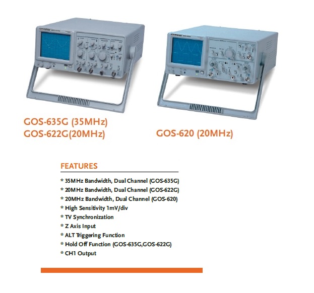 20MHz帶寬, 雙通道(GOS-620)高靈敏度為1mV/div;TV同步,Z軸輸入;ALT觸發(fā)功能,CHI輸出.
