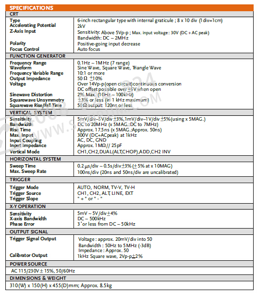 20MHz帶寬,雙通道;高靈敏度為1mV/div;電視同步,Z軸輸入;ALT觸發(fā)功能 保持關(guān)閉功能,CHI輸出,高品質(zhì)。