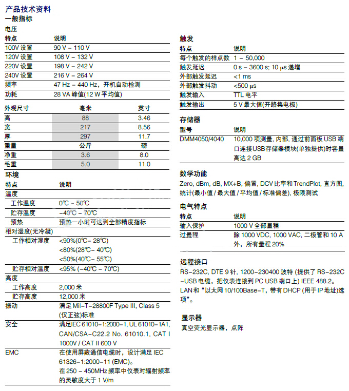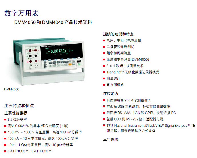 6.5位分辨率;高達0.0024%的基本VDC準確度(1年);100mV- 1000V電壓量程,高達100nV分辨率;100μA一10A電流量程,高達100pA分辨率;10Ω -1GΩ電阻量程,高達10μΩ分辨率;CAT I 1000V, CAT II 600V;電壓、電阻和電流測量 ;二極管和通斷測試;頻率和周期測量;2 x 4歐姆4線測量技術;TrendPlot?無紙化數(shù)據(jù)記錄器模式;測量統(tǒng)計。