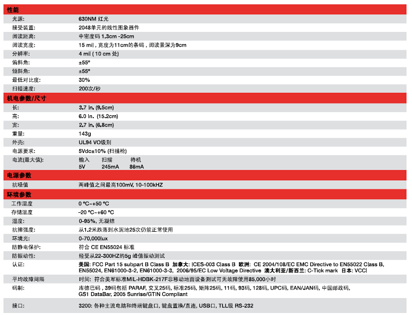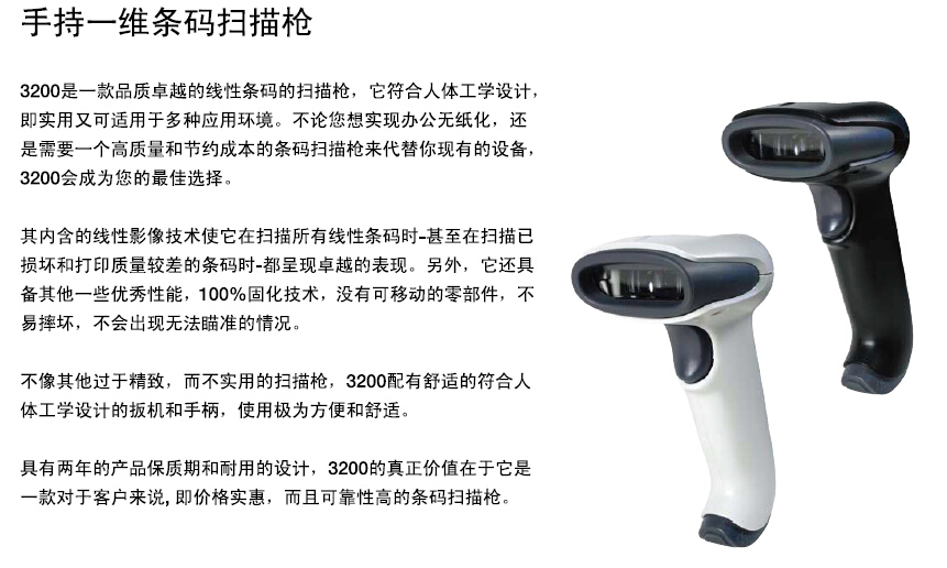3200是一款品質(zhì)卓越的線性條碼的掃描槍,它符合人體工學(xué)設(shè)計(jì),既實(shí)用又可適用于多種應(yīng)用環(huán)境.其內(nèi)含的線性影像技術(shù)使它在掃描所有線性條碼時(shí),甚至在掃描已損壞和打印質(zhì)量較差的條碼時(shí),都呈現(xiàn)卓越的表現(xiàn).
