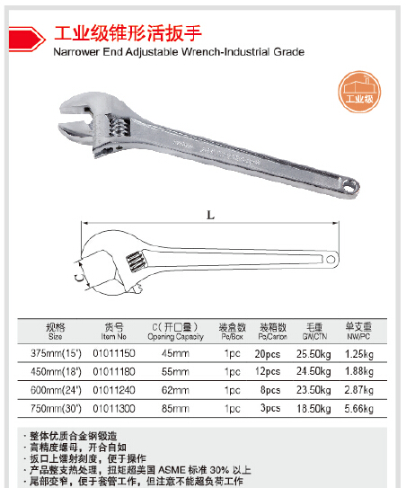整體優(yōu)質(zhì)合金鋼鍛造,高精度螺母,開合自如,扳口上鐳射刻度,便于操作.整支熱處理,扭矩超美國ASME標(biāo)準(zhǔn)30%以上,尾部變窄,便于套管工作,但注意不能超負(fù)荷工作.