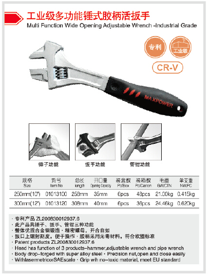 專利產(chǎn)品ZL200830012937.6,此產(chǎn)品具錘子、扳手、管鉗三種功能,整體優(yōu)質(zhì)合金鋼鍛造,精密螺母,開合自如,扳口鐳射刻度,便于操作,膠柄采用無毒材料,符合歐盟標(biāo)準(zhǔn).