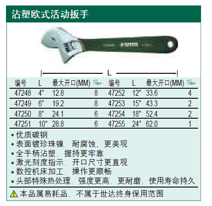 優(yōu)質(zhì)碳鋼,表面鍍珍珠鎳,耐腐蝕,更美觀,全手柄沾塑,握持更牢靠,激光刻度指示,開(kāi)口尺寸更直觀.數(shù)控機(jī)床加工,操作更順暢.頭部特殊加熱處理,強(qiáng)度更高,更耐磨,使用壽命持久.*本品屬易耗品,不屬于世達(dá)終身保用范圍.