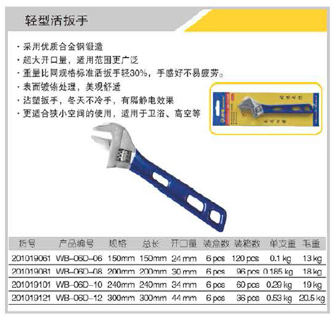 采用優(yōu)質(zhì)合金鋼鍛造,超大開口量,適用范圍更廣泛,重量比同規(guī)格標(biāo)準(zhǔn)活扳手輕30%,手感好不易疲勞.表面鍍鉻處理,美觀舒適.沾塑扳手,冬天不冷手,有隔靜電效果,更適合狹小空間的使用,適用于衛(wèi)浴、高空等.