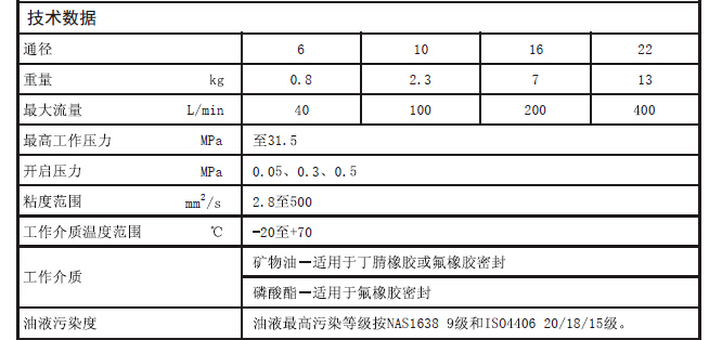 通徑(NG)6至22;壓力至31.5MPa;流量至400L/min。