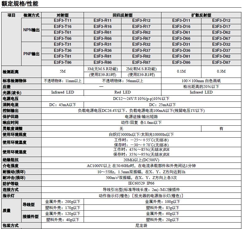E3F3-D11 圓柱型漫反射10CM E3S-2E4 對(duì)射式 2M E3F3-D12 圓柱型漫反射30CM E3S-5E4 對(duì)射式 5M