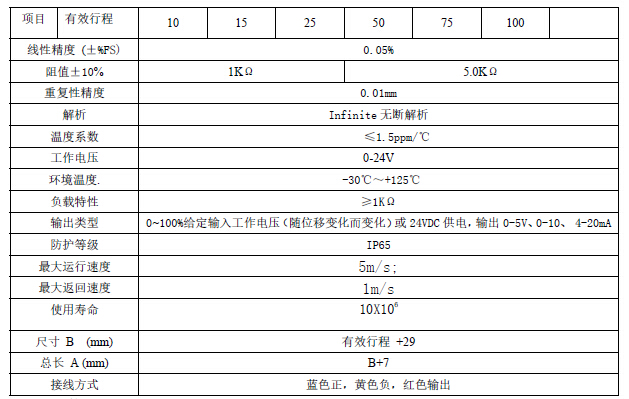 有效行程0~100mm; 高精度0.3%FS; 體積??; 安裝方便; 使用壽命長;
